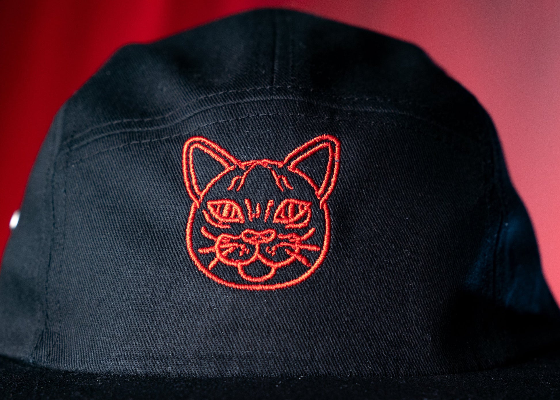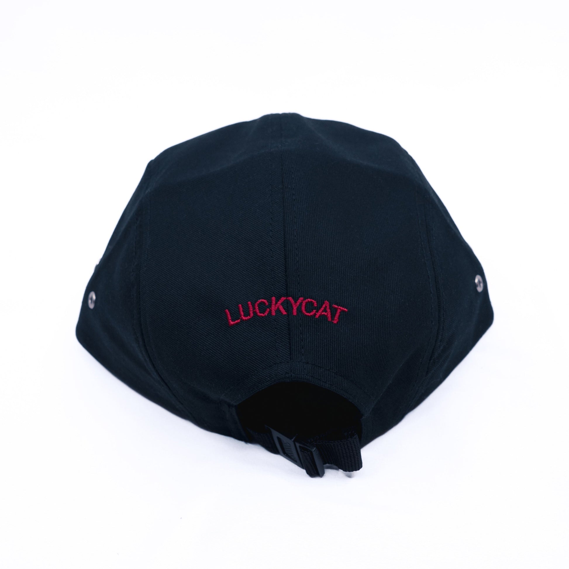 The 'Cat' Logo 5 Panel Cap in black is a mid-weight, low-profile silhouette designed for everyday wear. Made from durable 100% cotton, it features a flat peak, metal side eyelets for breathability, and an adjustable plastic fastener for a secure, comfortable fit. Finished with a red embroidered 'Cat' logo centred on the front panel, as well as red embroidered 'Lucky Cat' text centred on the back of the cap.
