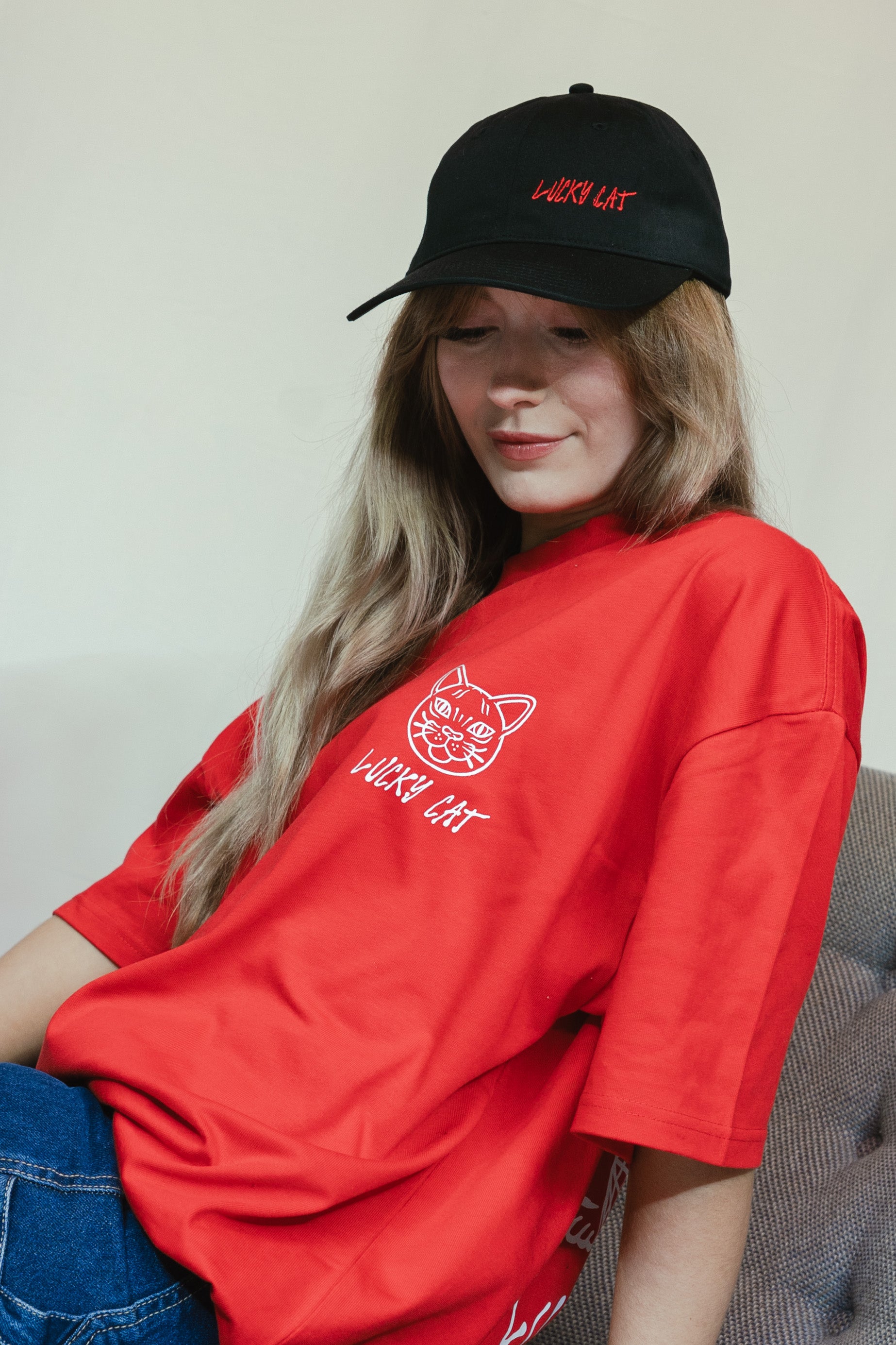 The 'Disco Cat' T-Shirt in red offers a boxy, relaxed silhouette with a substantial heavyweight feel. Crafted from premium 280 GSM 100% cotton, it delivers a structured drape and durable finish suited for everyday wear. Built with wide rib neck detailing, side seams, and shoulder-to-shoulder tape, this tee is completed with a white left-chest and back Cat Head and Lucky Cat Logo graphic, screen printed for lasting clarity.