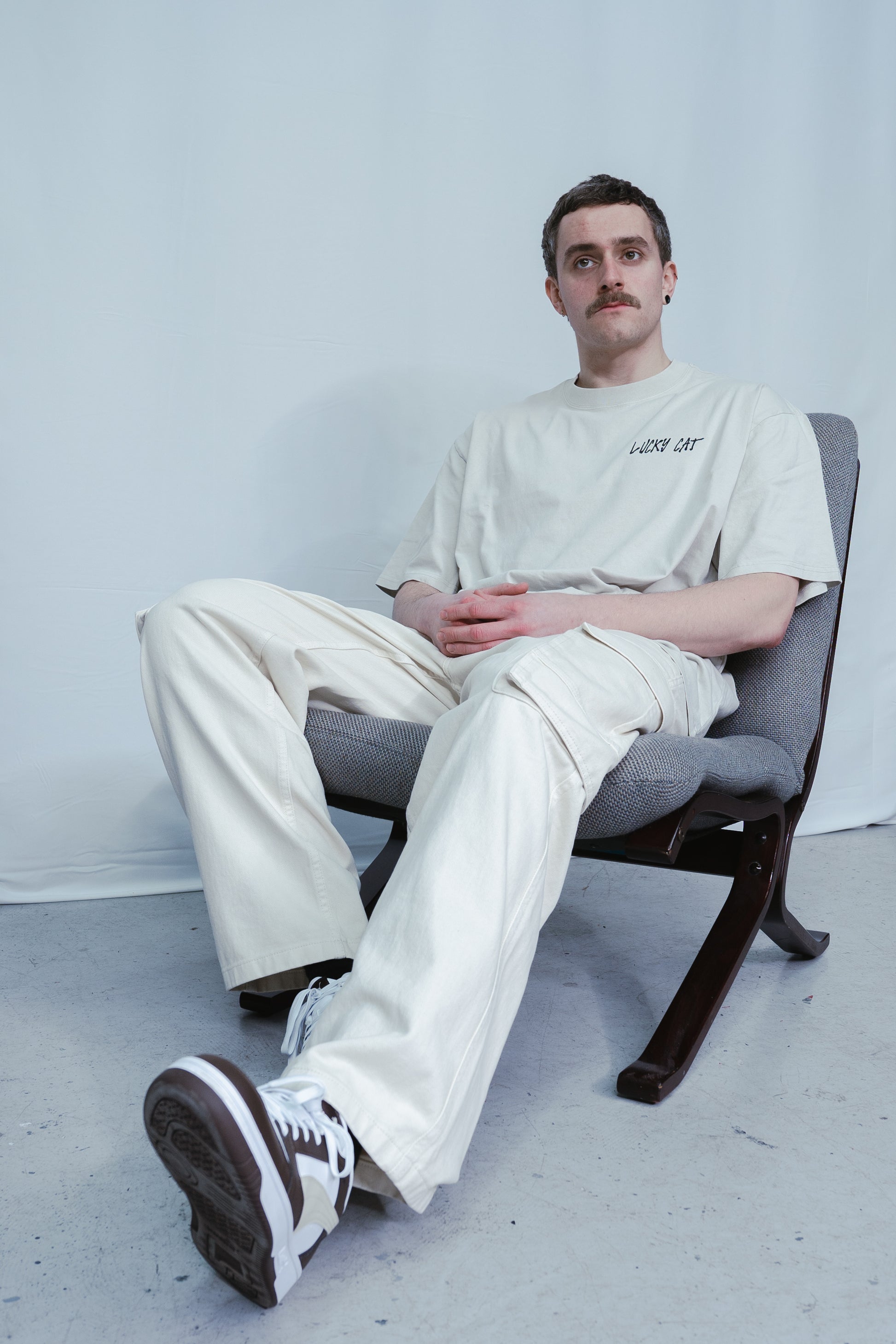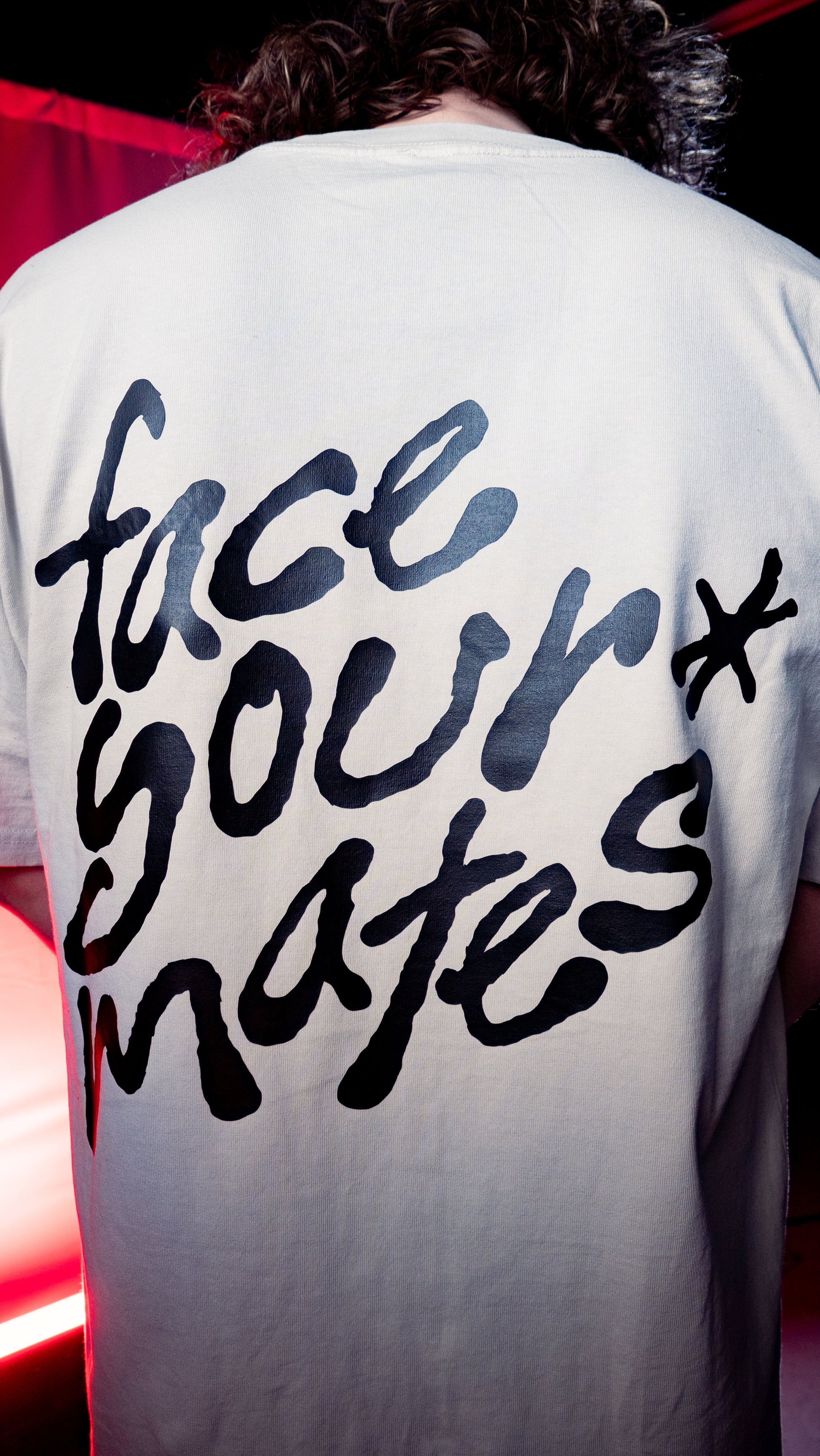 The 'Face Your Mates' T-Shirt in bone offers a boxy, relaxed silhouette with a heavyweight feel. Crafted from premium 240 GSM 100% cotton, it features a garment-dyed finish for a soft handfeel and subtle tonal fade. Built with a wide twin-stitched rib neck and dropped shoulders, this tee is finished with a black left-chest 'Lucky Cat' embroidery and a bold black 'Face Your Mates' back graphic, screen printed for durability and clarity.